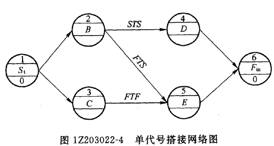 (5)单代号搭接网络计划是前后工作之间有多种逻辑关系的肯定型网络计划,如图1Z203022-4所示。前后工作之间的多种逻辑关系包括: